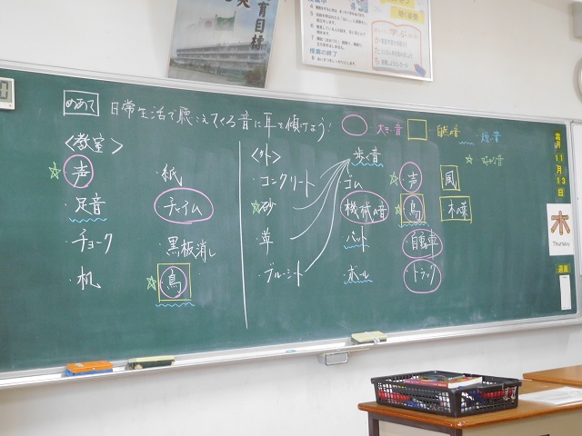 音楽の授業です。身の回りにある音さがしを行いました。この活動がどんな授業につながっていくのでしょうか?楽しみですね!!