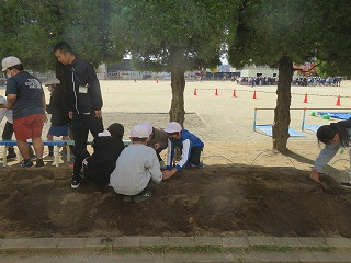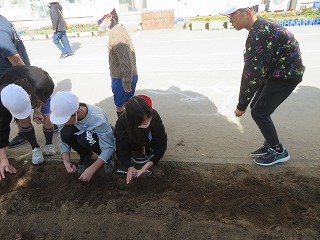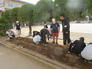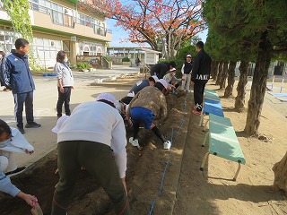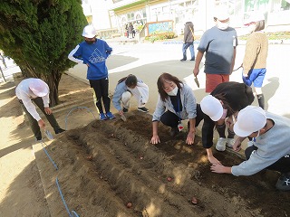 花壇にチューリップの球根を植えてくれました。手前側と奥側で違う種類の球根を植えました。