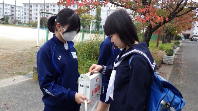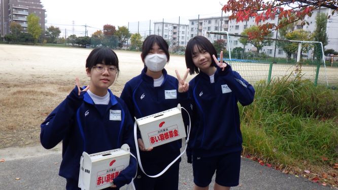 朝の寒い時間、生徒会のメンバーが挨拶運動と一緒に、赤い羽根募金を行っています。