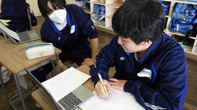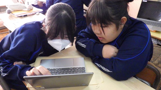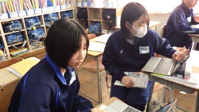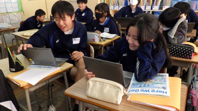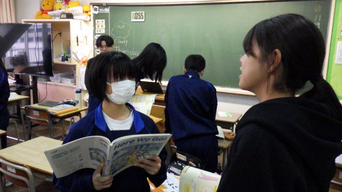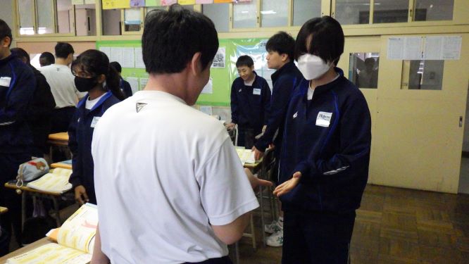 英語の時間ではペアワークをしました。ペアでお互いに質問をしあっています。