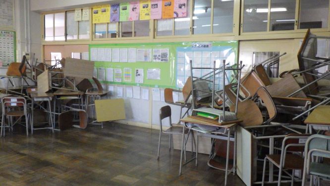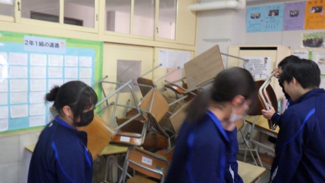 避難訓練が始まると、教室の机や椅子を使ってバリケードを作りました。