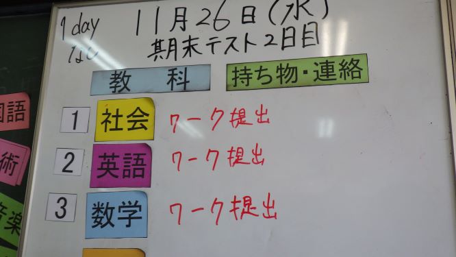 明日は、社会、英語、数学、保体の4教科です。しっかり勉強してテストに臨みましょう。