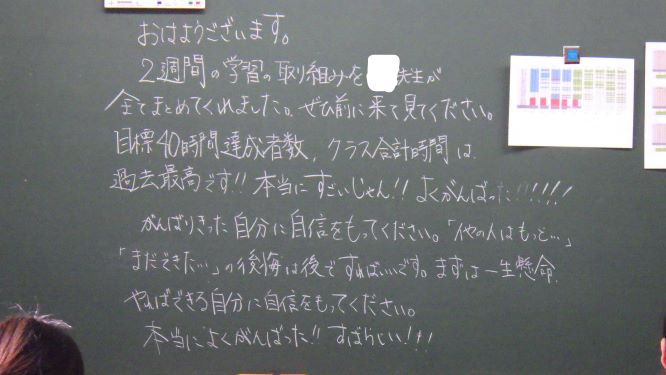 今日の朝の黒板には、Y先生からの誉め言葉が。