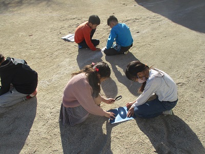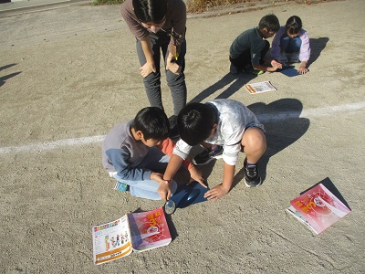 実験では、ペアの友達と虫眼鏡を使って、日光の集まり方を調べました。午後の学習になったので、虫眼鏡の角度調整が難しく、初めのうちは日光を集めるところまでいきませんでした。
