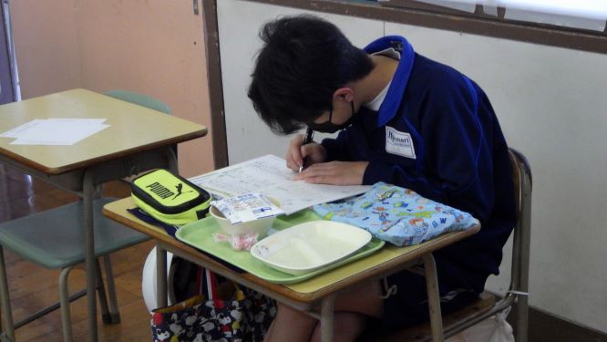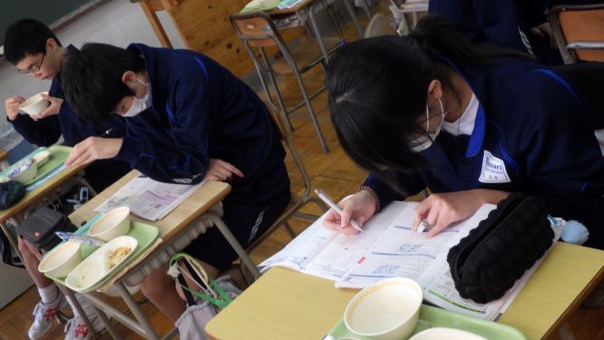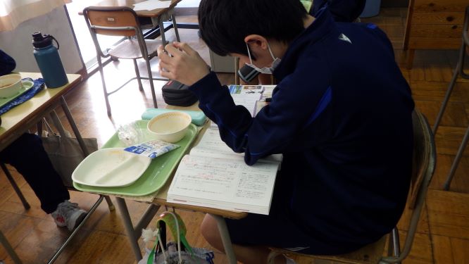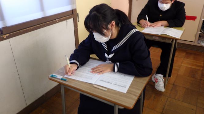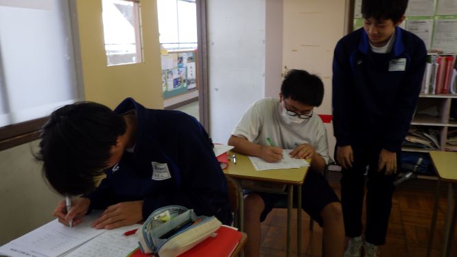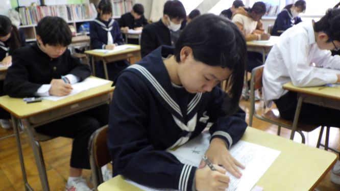 今日も英語。いつものペアワーク後、本文の音読練習と英作文の練習をしました。期末テストまであと5日。