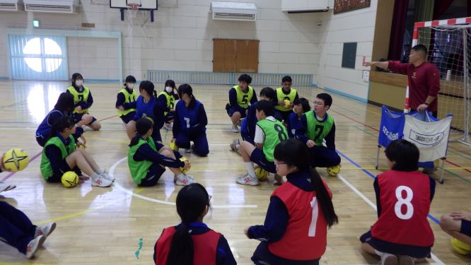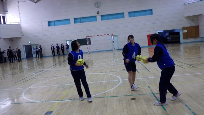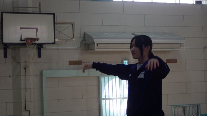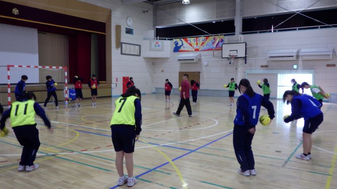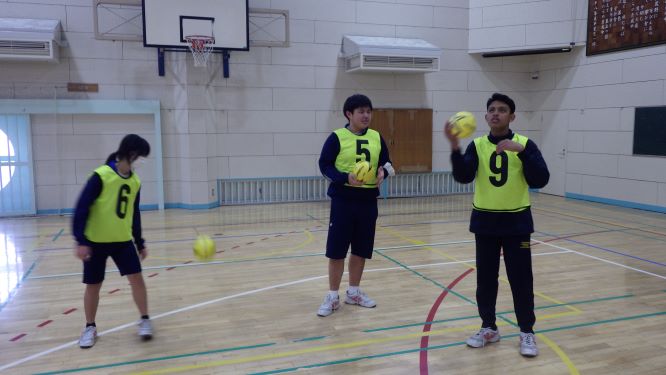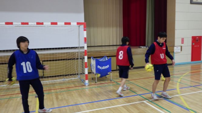 体育館では選択ハンドボール。ボール回しでウォーミングアップ。