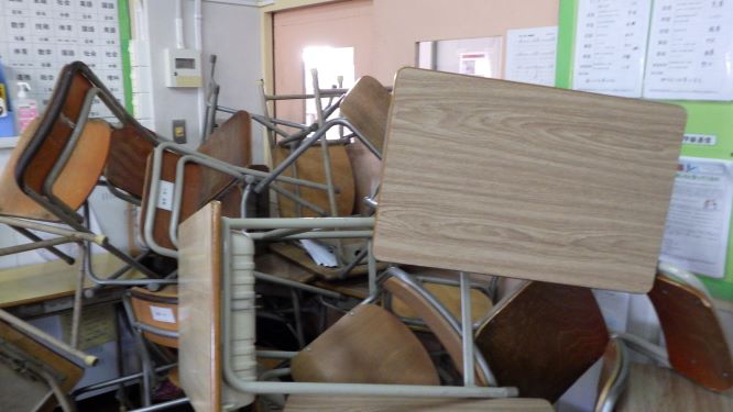 午後は不審者対応の避難訓練。教室では不審者の侵入を防ぐために、机でバリケードを築きました。