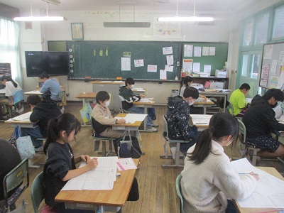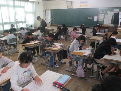 静寂の中、子供たちはそれぞれの学年まで学んできた内容が、」どれだけ身に付いているかの、総合学力テストに取り組みました。どの子も集中して、よくがんばっていました。