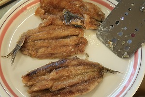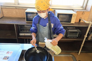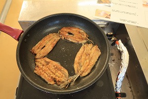 2年生が、調理実習として「イワシのかば焼き」を作っていました。事前学習でまとめたメモを見たり、班内で作業を分担しながら、慎重に調理工程を進めていました。