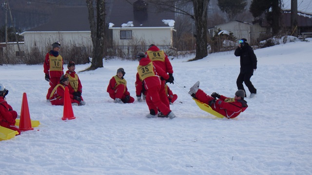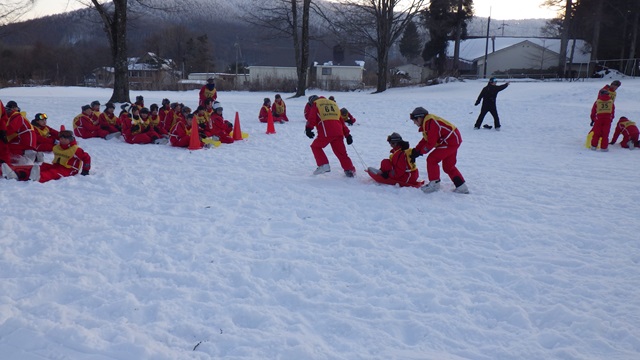 (1)スノーフラッグ、(2)そりレース。残念ながら(3)雪だるま作りは雪が固く、断念。代わりに、雪上リレーを行いました。