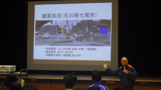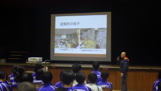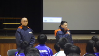 本日6校時、三郷市危機管理課の豊田さんと脇野さんをお招きし、2学年「防災学習」スタート集会を行いました。