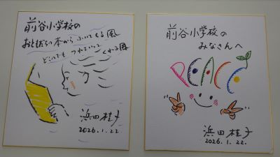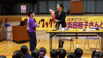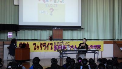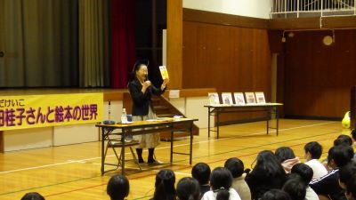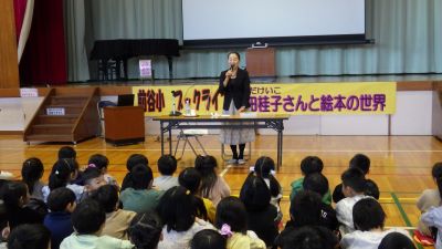 今週は前谷小読書ウィーク。そのイベントの一つとして「前谷小ブックライブ」を開催しました。今年度は絵本作家の浜田桂子さんに御来校いただきました。多数の作品の中で、今日は絵本「へいわって どんなこと?」について、読み聞かせや絵の意味など、作品に込めた思いを伝えていただきました。浜田桂子さん、ありがとうございました。