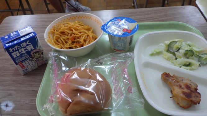 今日はパンとスパゲティ。チキンにサラダにヨーグルトも!