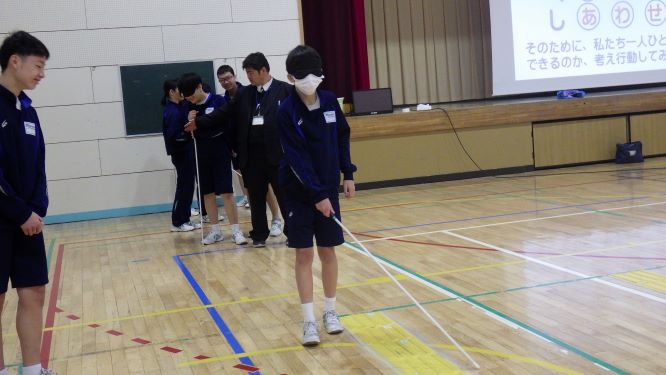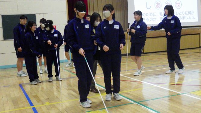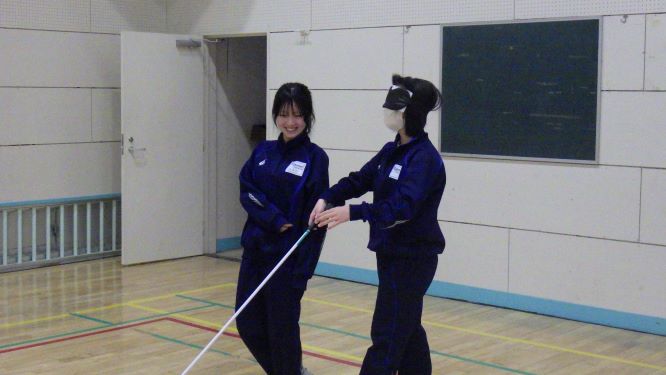 初めての福祉体験で、新たな学びがたくさんありました。白杖体験では見えない中で歩くことの怖さや難しさに気づいたようです。