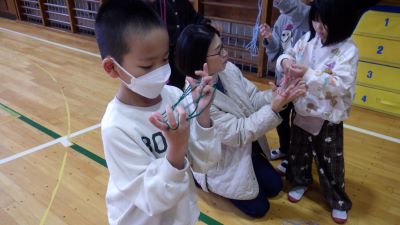 生活科の学習の一環として、1年生の昔遊び体験が行われました。保護者、地域の方にご協力をお願いして、あやとり、竹とんぼ、めんこ、ヨーヨー、こま回し、けん玉を体験することができました。昔の遊びに子供たちは夢中になっていました。