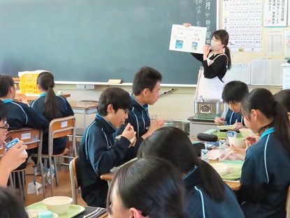 4日(水曜日)、栄養教諭が1年3組と2年3組で食育指導を行いました。身体をつくる大切な栄養素であるカルシウムのはたらきと窃取方法についてわかりやすく説明しました。自分のからだにあった方法で、カルシウムをしっかりとることが大切だと思いました。みんな先生の話を聞きながらおいしそうに給食を食べていました。
