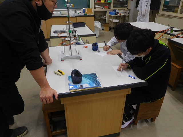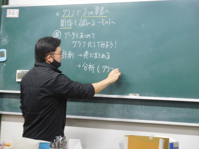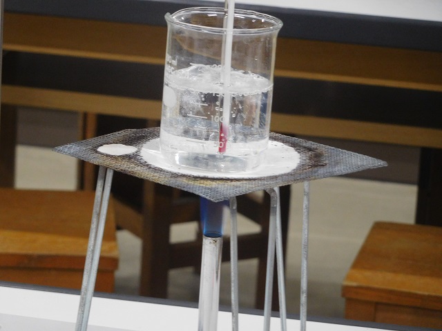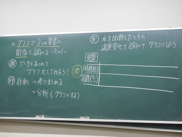 理科の授業です。水を加熱して、温度の記録をとりグラフの書き方を学習しました。データを集め、グラフを仕上げることができました!