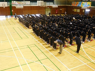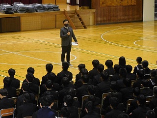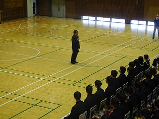 最初はなかなかそろわなかった起立と着席、礼のタイミングでしたが練習を重ねるたびに成長が見られました。本日の指導講評は、昨年度の司会を務めた1学年主任の先生。「世界一の卒業式」、心に響く言葉をいただきましたね。