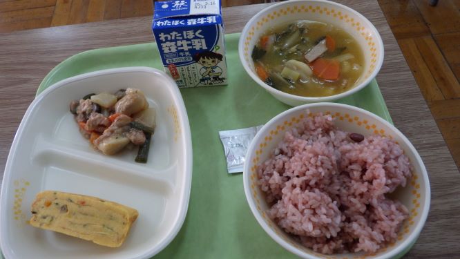今日の給食は、卒業を祝っての赤飯です。明日はチョコケーキが出るそうですよ。お楽しみに!