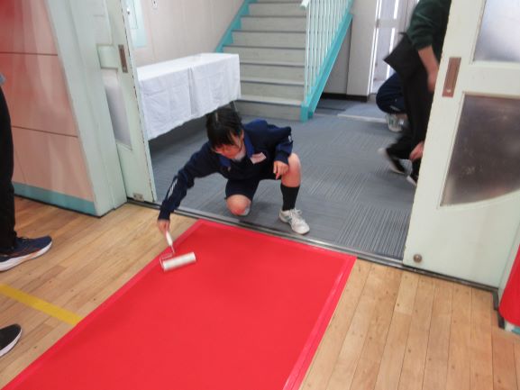 椅子の位置を示す印を貼ったり、ステージや入口、体育館のトイレの掃除をみんなで協力して行っています。
