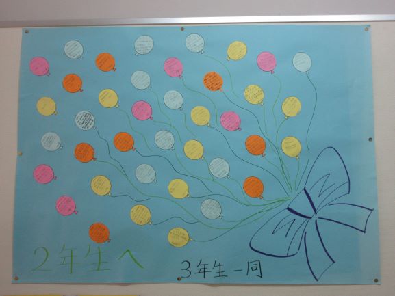 今日の朝、登校すると廊下には卒業した3年生から2年生に向けたメッセージが飾られていました。