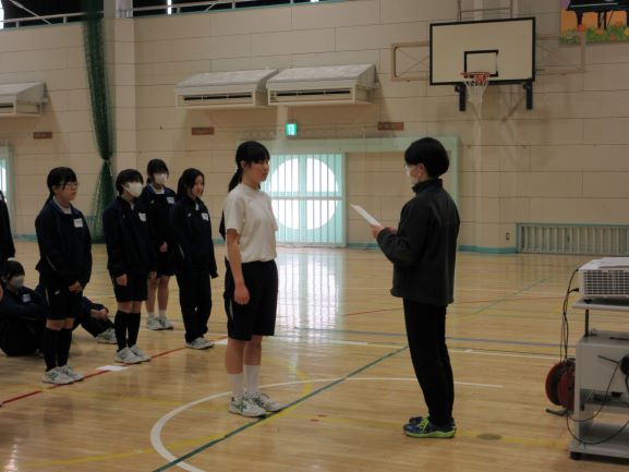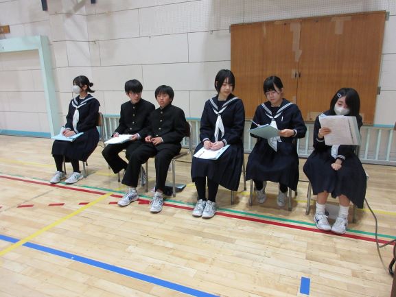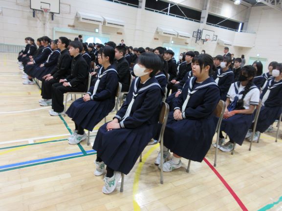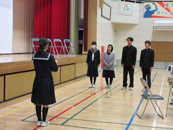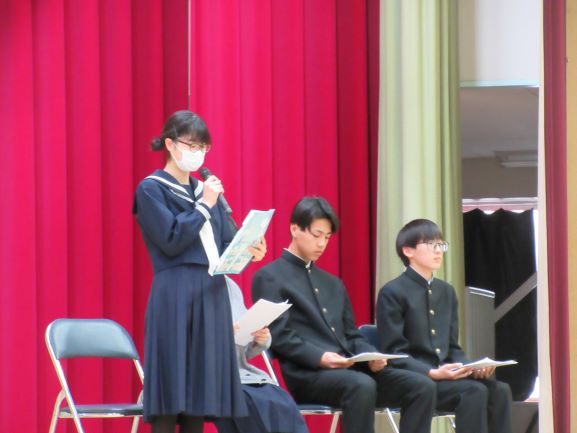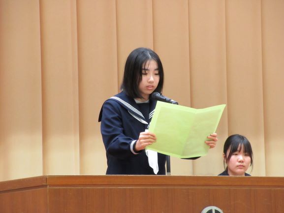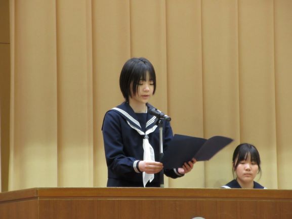 生徒会代表としてSさん、2年生代表としてHさんが、2年生のまとめや来年度に向けた抱負を話しました。