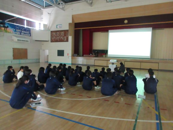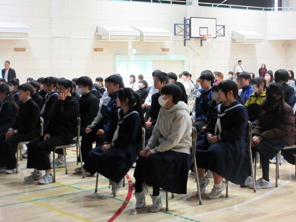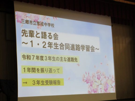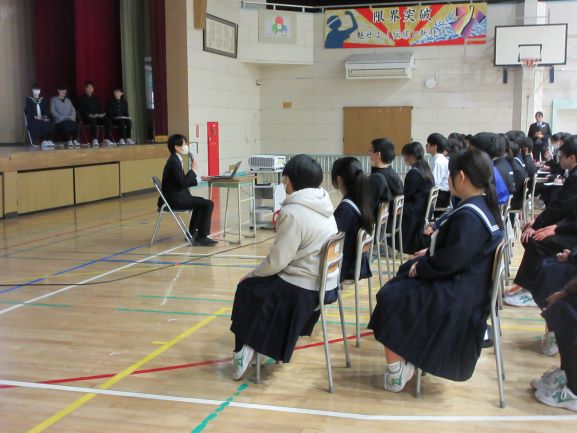 5時間目の、1・2年生合同進路学習会では、進路指導のH先生や受験を終えた3年生から話を聞きました。