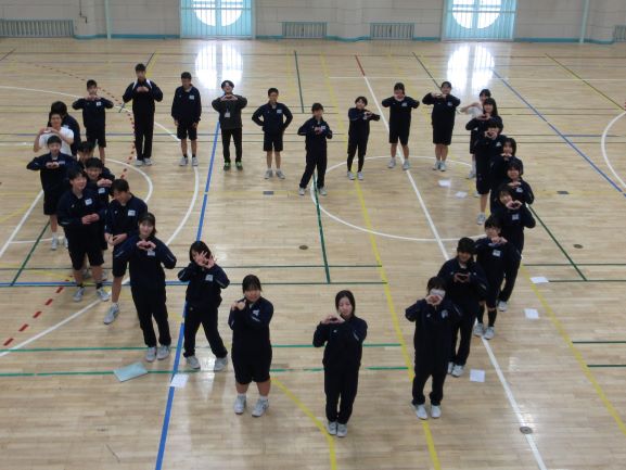 最後は、去年も行った人文字づくり。学級委員が上から指示を出して形を作っていきます。