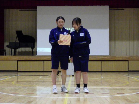 生徒会代表としてSさん、2年生代表としてHさんが、2年生のまとめや来年度に向けた抱負を話しました。