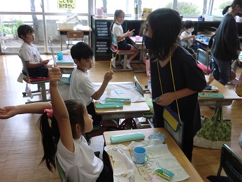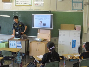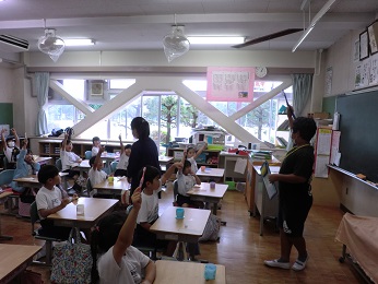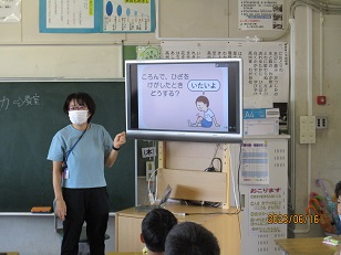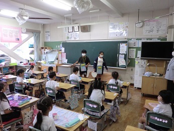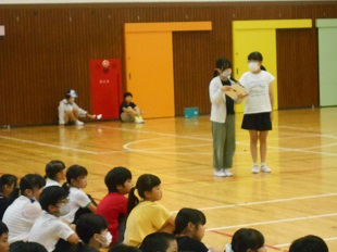 今日の歯みがきの時間、保健委員会の皆さんが1年生に歯みがき指導をしてくれました。