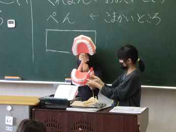 大きな歯の模型を使い、歯の磨き方を教えてくれました。