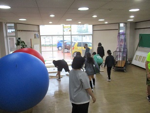 今朝のおはよう運動は雨天のため、屋内で行いました。