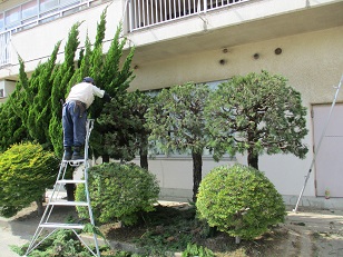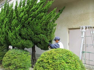 ボランティアの方が、校舎前の植木の剪定をしてくださっています。