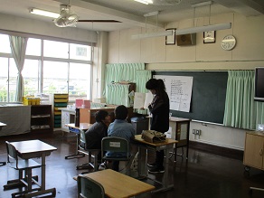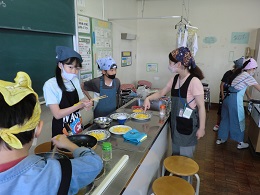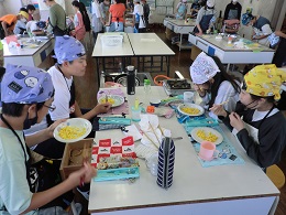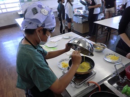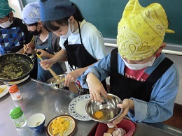 5年生が調理実習でスクランブルエッグを作っていました。