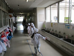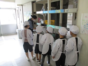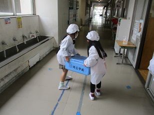 当番の人は給食着に着替え、先生と一緒に食缶や食器を取りに行きます。